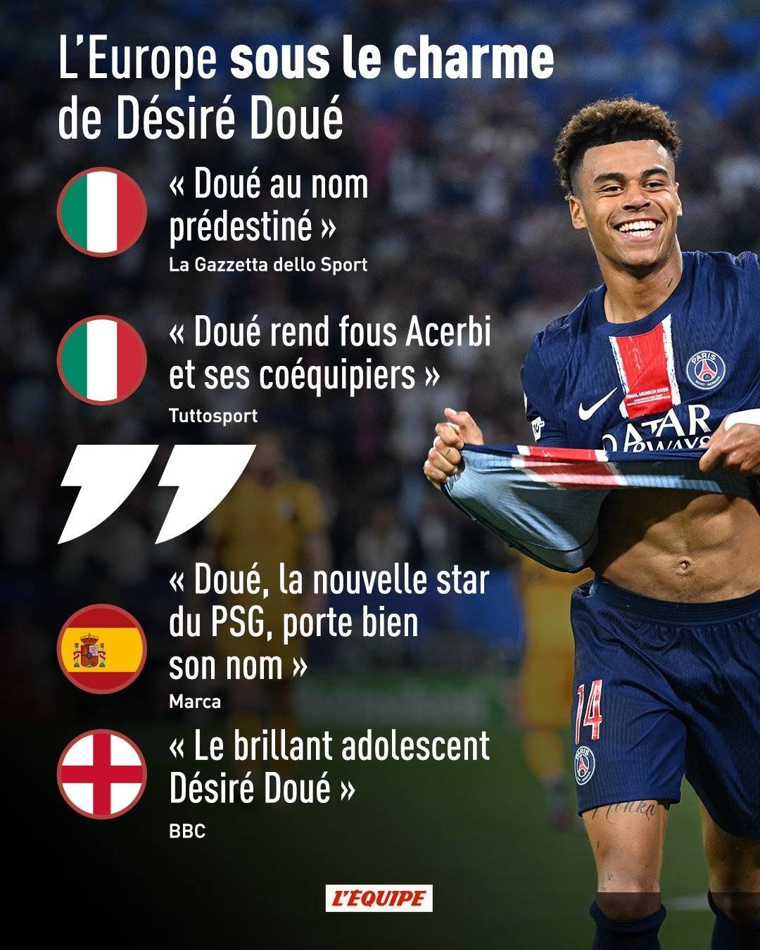 “对迪马尔科而言这是噩梦之夜,而对杜埃则是狂欢之夜。他成为欧冠决赛中进球并助攻的第二年轻球员……仅次于1968年随曼联夺冠的布莱恩-基德。荣耀属于杜埃,几分钟后他在超过半座球场的起立掌声中被换下。杜埃名副其实(注:Doué在法语中有‘天赋’之意)。去年夏天杜埃以5000万欧元从雷恩转会而来。他悄无声息地降临王子公园球场,并未引起太多轰动。事实上,他赛季初只是巴尔科拉的替补……但最终取代了后者……并让我们至少部分遗忘了姆巴佩。他那不拘一格且难以预测的风格为巴黎的进攻注入了新活力。”